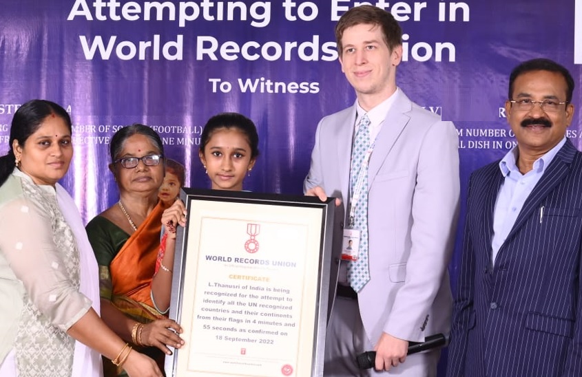 L.Thanusri of India is being recognized for the attempt to identify all the UN recognized countries and their continents from their flags in 3 minutes and 44 seconds as confirmed on 18 September 2022
