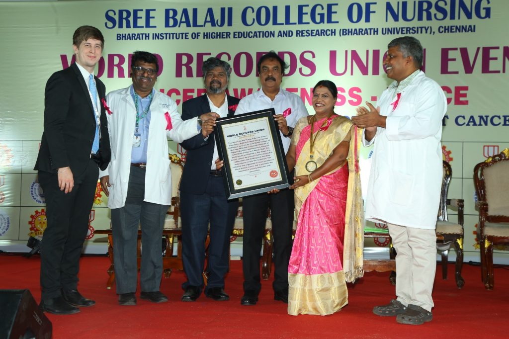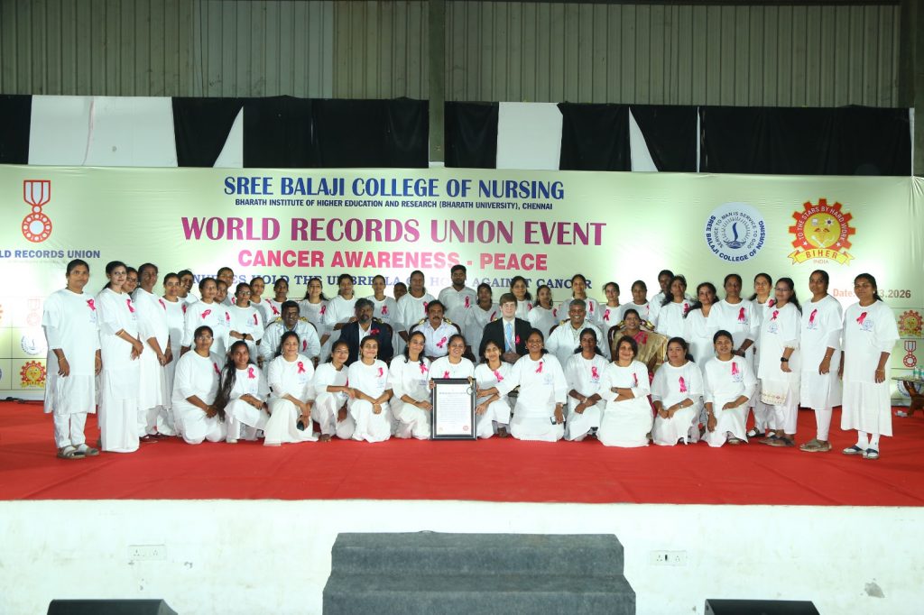The record for the “Largest Breast Cancer Awareness Ribbon Formed Using Colored Umbrellas” consists of 526 participants and was set by Sree Balaji College of Nursing, Affiliated to Bharath Institute of Higher Education and Research, Chennai, Tamil Nadu (India) on 6 March 2026. The participants assembled in the shape of a breast cancer awareness ribbon, dressed in white attire and holding pink and blue umbrellas to create the formation. The initiative was organized to raise awareness about breast cancer and to promote the importance of early detection and prevention.