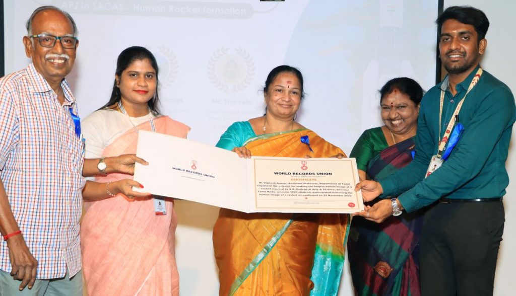S.A. College of Arts & Science, Chennai Tamil Nadu India is being recognized for making the largest human image of a rocket. The attempt took place at the college premises wherein 1000 students participated in forming the human image of a rocket.