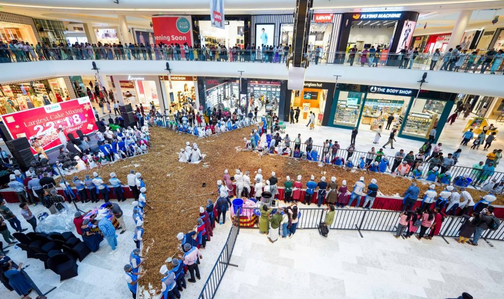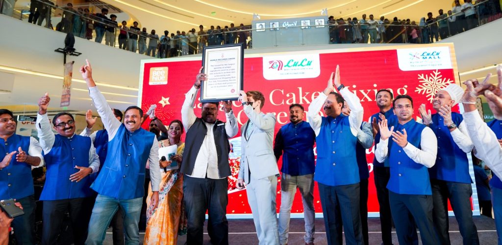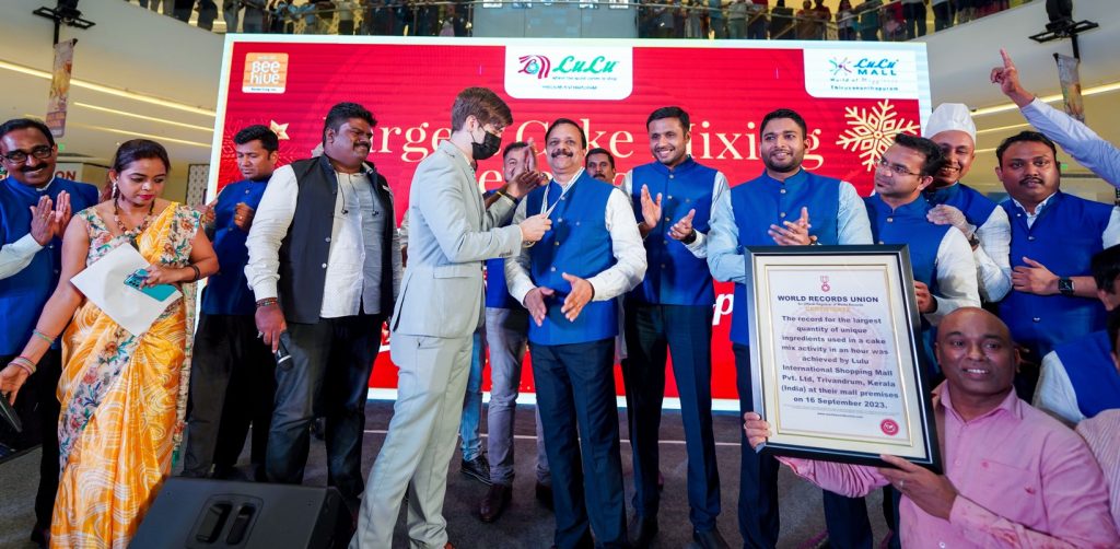 The record for the largest quantity of unique ingredients used in a cake mix activity in an hour is 6017 kilograms was achieved by Lulu International Shopping Mall Pvt. Ltd, Trivandrum, Kerala (India) at their mall premises on 16 September 2023. A team of 254 participants took part in this attempt.