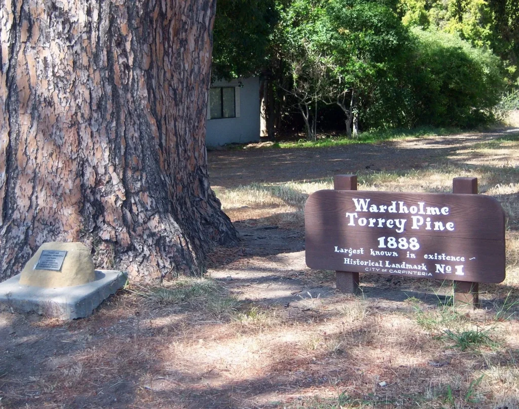 The record for the largest torrey pine tree measuring 126 feet tall, with a 20′ 5″ circumference, and 130′ branch spread at Carpinteria, California