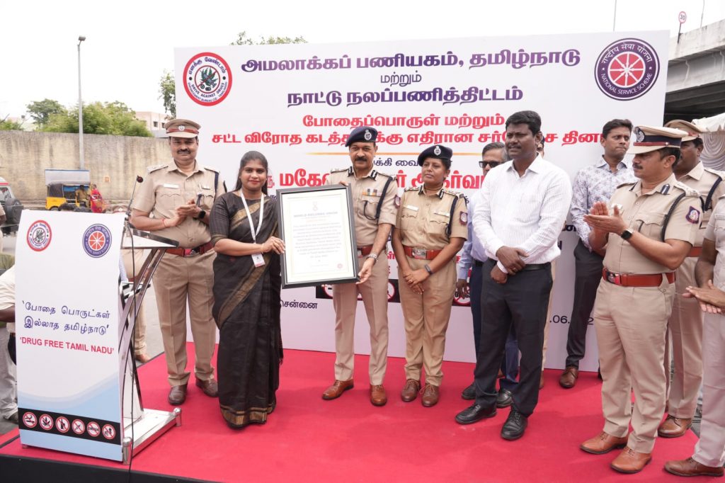 The record for the maximum number junctions covered to spread Anti-Drug awareness simultaneously is 6500 spots and was achieved by Enforcement Bureau CID, Tamil Nadu jointly with National Service Scheme, Tamil Nadu. Anti-drug awareness activities were held at 6,000 junctions throughout the state of Tamil Nadu (India) on 26 June 2023