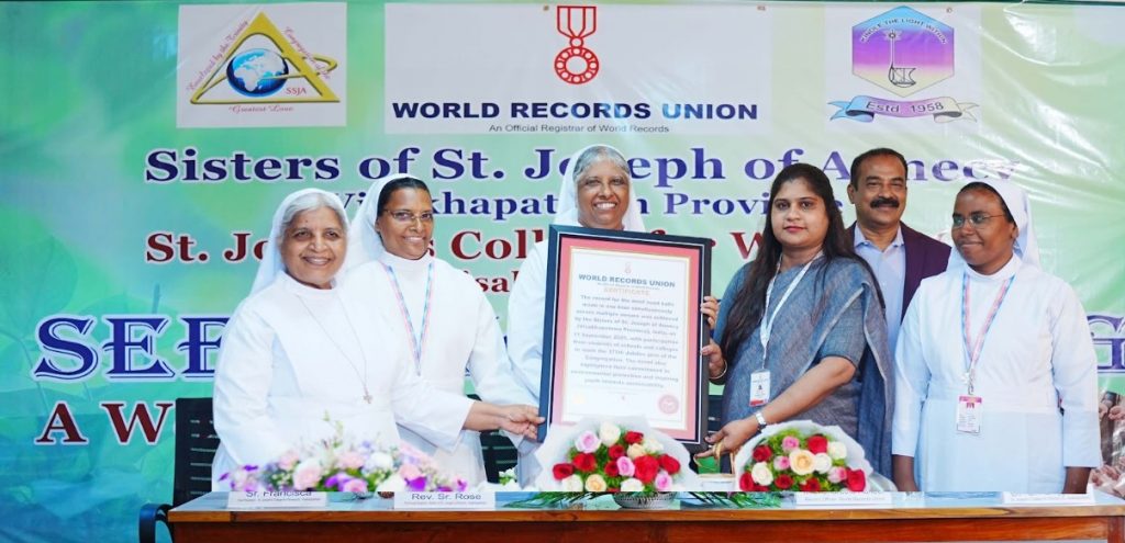 The record for the most seed balls made in one hour simultaneously across multiple venues is 1,190,796 by 10,496 participants across 16 venues and was achieved by the Sisters of St. Joseph of Annecy (Visakhapatnam Province), India, on 11 September 2025, with participation from students of schools and colleges to mark the 375th Jubilee year of the Congregation. The event also highlighted their commitment to environmental protection and inspiring youth towards sustainability.