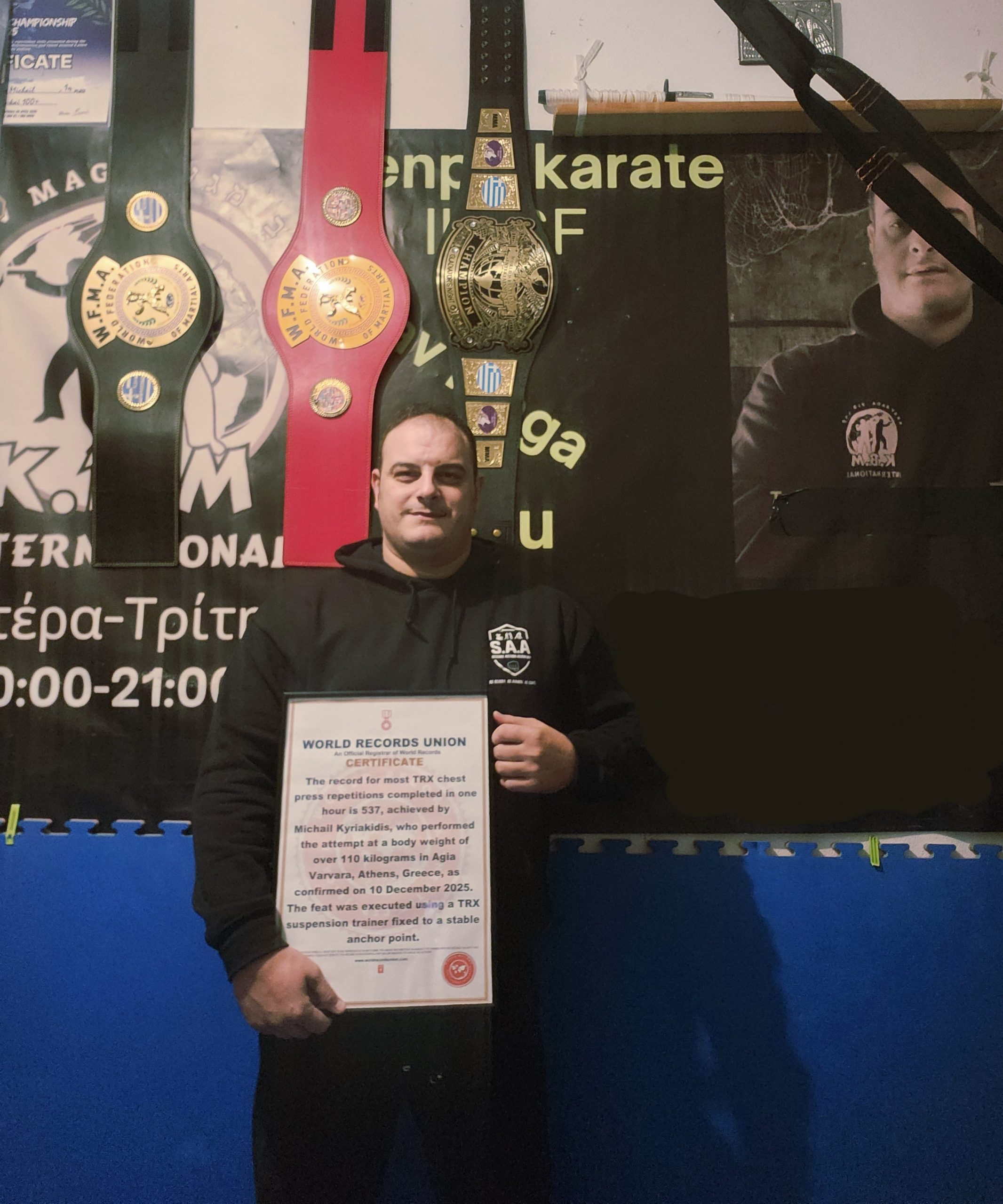 The record for most TRX chest press repetitions completed in one hour is 537, achieved by Michail Kyriakidis, who performed the attempt at a body weight of over 110 kilograms in Agia Varvara, Athens, Greece, as confirmed on 10 December 2025. The feat was executed using a TRX suspension trainer fixed to a stable anchor point.